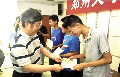 7月23日上午,郑州大学2016级15名准大学生收到了一份特殊礼物——中国工程院院士、郑州大学校长刘炯天签字并颁发录取通知书。据悉,这15人是郑州大学2016届新生代表,分别来自河南、北京、山东等省内外不同地方,此次到郑大除了领取通知书外,还将提前了解学校环境,与校长、老师进行面对面交流。