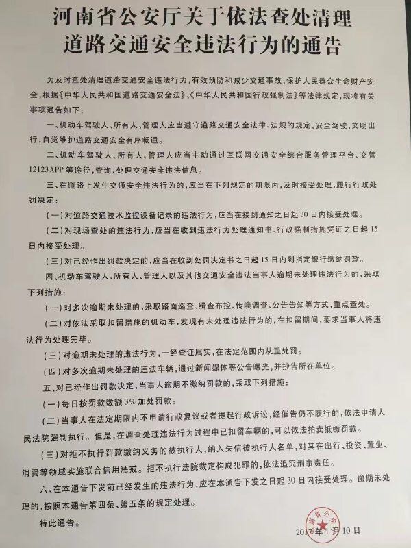 为及时查处清理道路交通安全违法行为,有效预防和减少交通事故,保护人民群众生命财产安全,根据《中华人民共和国道路交通安全法》、《中华人民共和国行政强制法》等法律规定,河南省公安厅发布依法查处清理道路交通安全违法行为的通告。